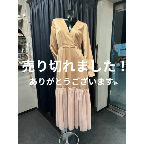 | ベージュ サテン地 Vネック ロングスリーブ ロングドレス | |